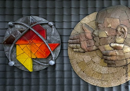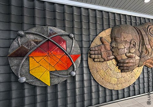 Es un mural realizado en bajo-relieve cerámico y tejas de gran escala, pensado para el entorno arquitectónico de una estación urbana muy transitada.